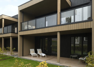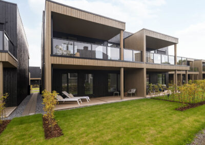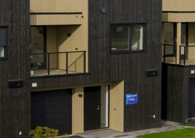 Boligen har garasje med sportsbod i umiddelbar nærhet til inngangsdøren. Bilen kan også parkeres på asfaltert gårdsplass rett utenfor. Det medfølger eksklusiv bruksrett til plen- og hageareal på fremsiden og baksiden av boligen.
