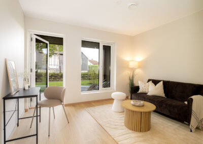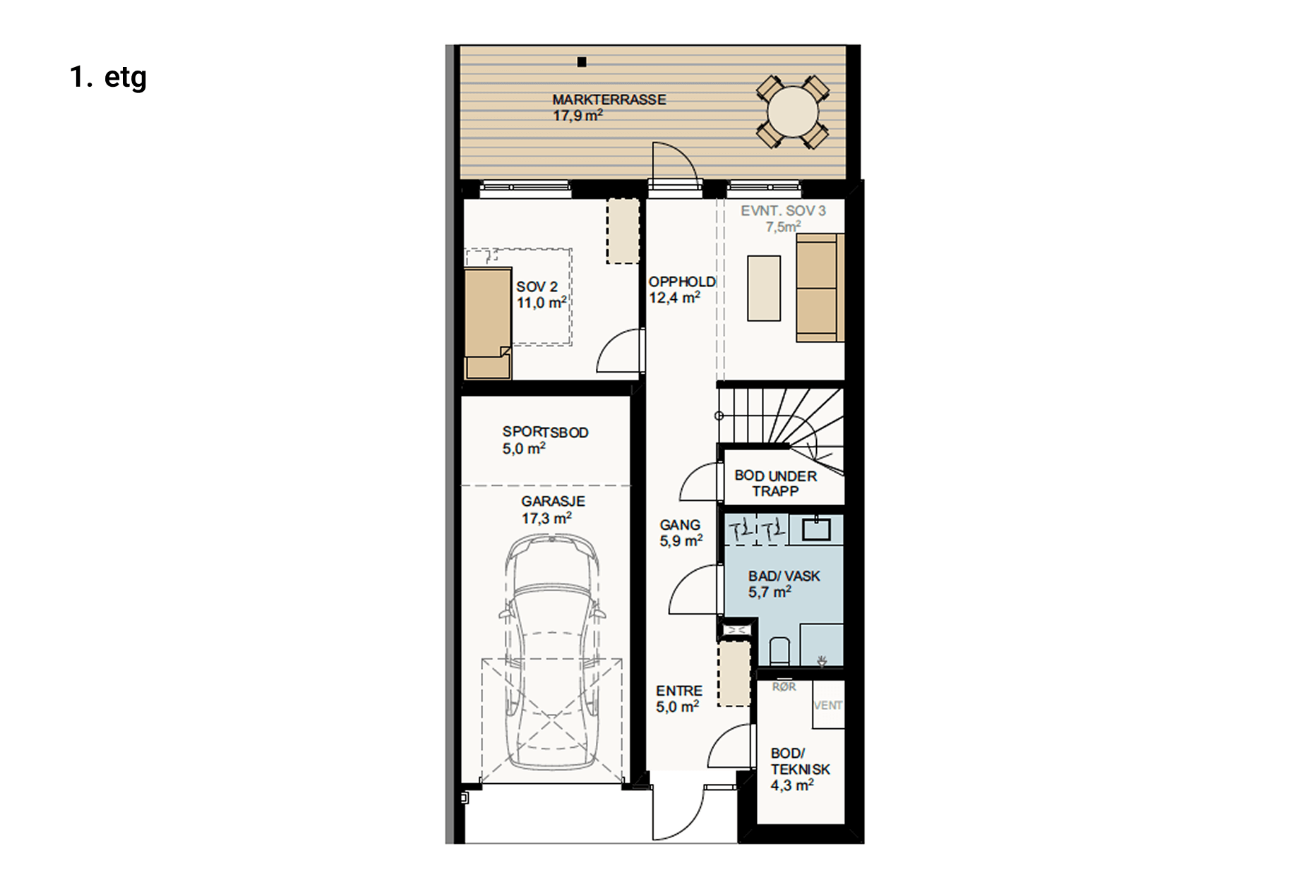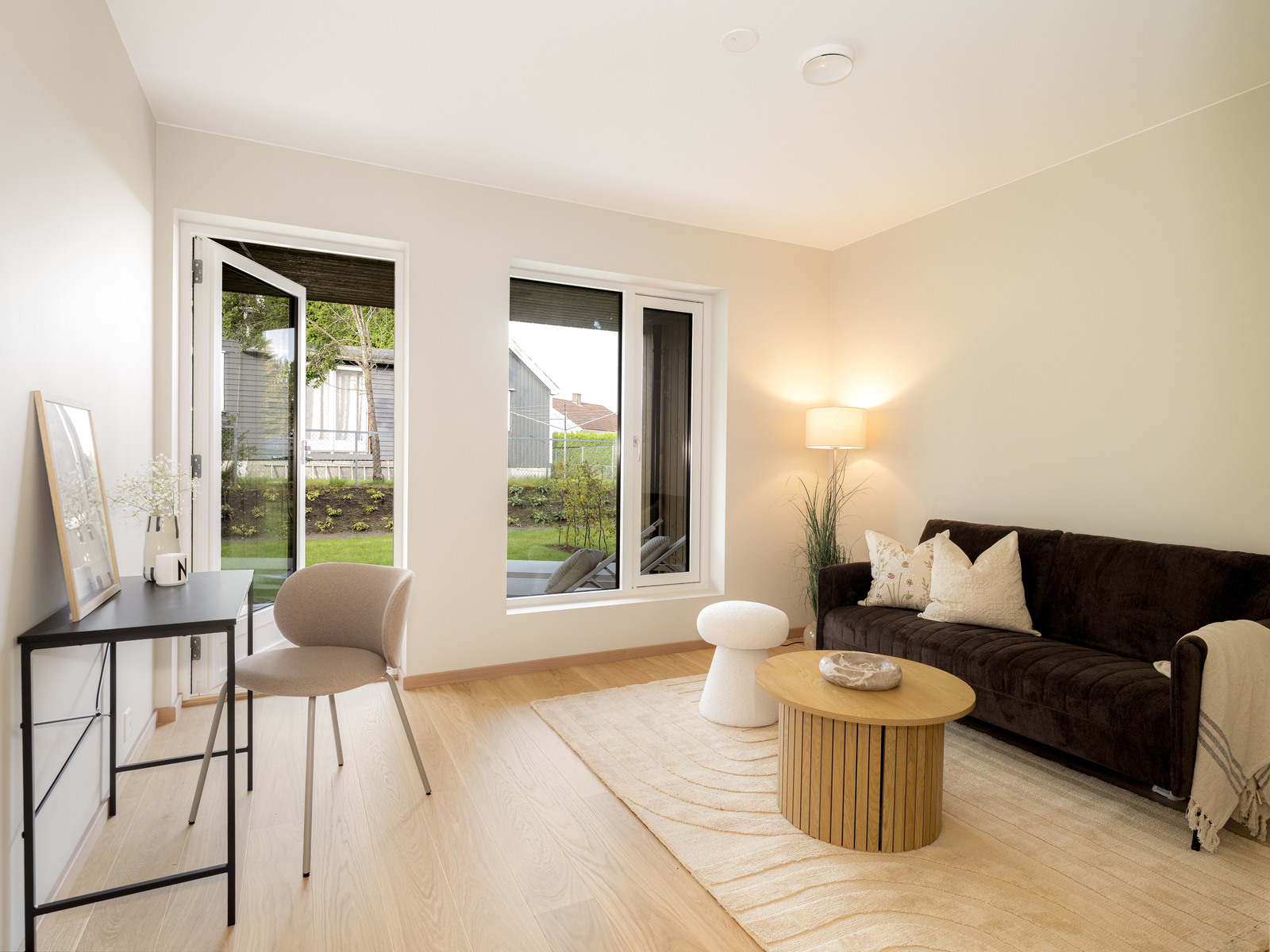 Første etasje har gang, bad/vaskerom og og godt med oppbevaringsplass i to boder. Den ene boden er smart plassert i forbindelse med trappen, og utnytter plassen under den. I denne etasjen finner du ett soverom, pluss et disponibelt oppholdsrom som kan skilles av til boligens tredje soverom, kontor, ekstra tv-stue eller en egen «gjesteavdeling». Etasjen har i tillegg utgang til en romslig markterrasse på 17,9 m² mot vest.