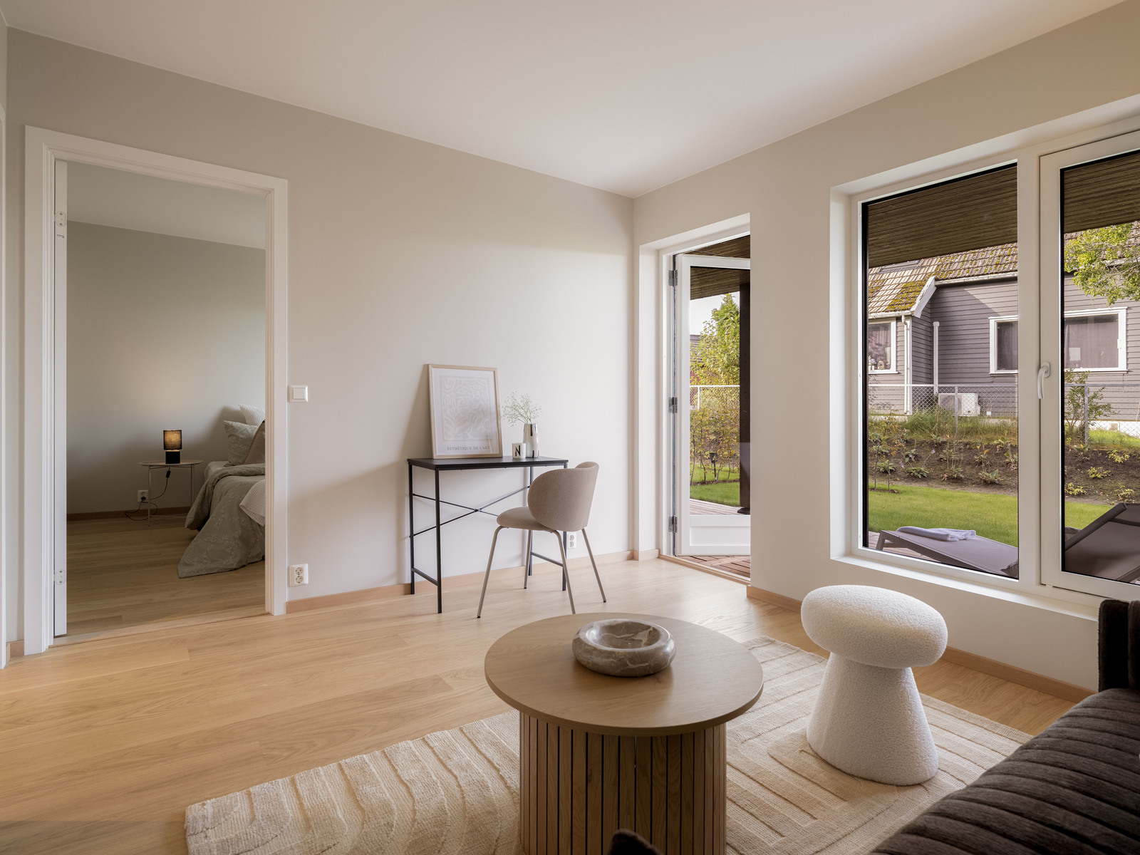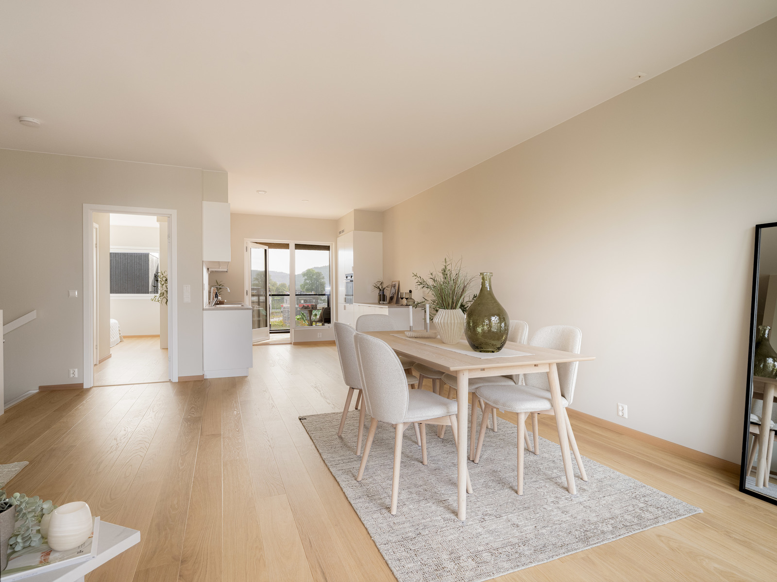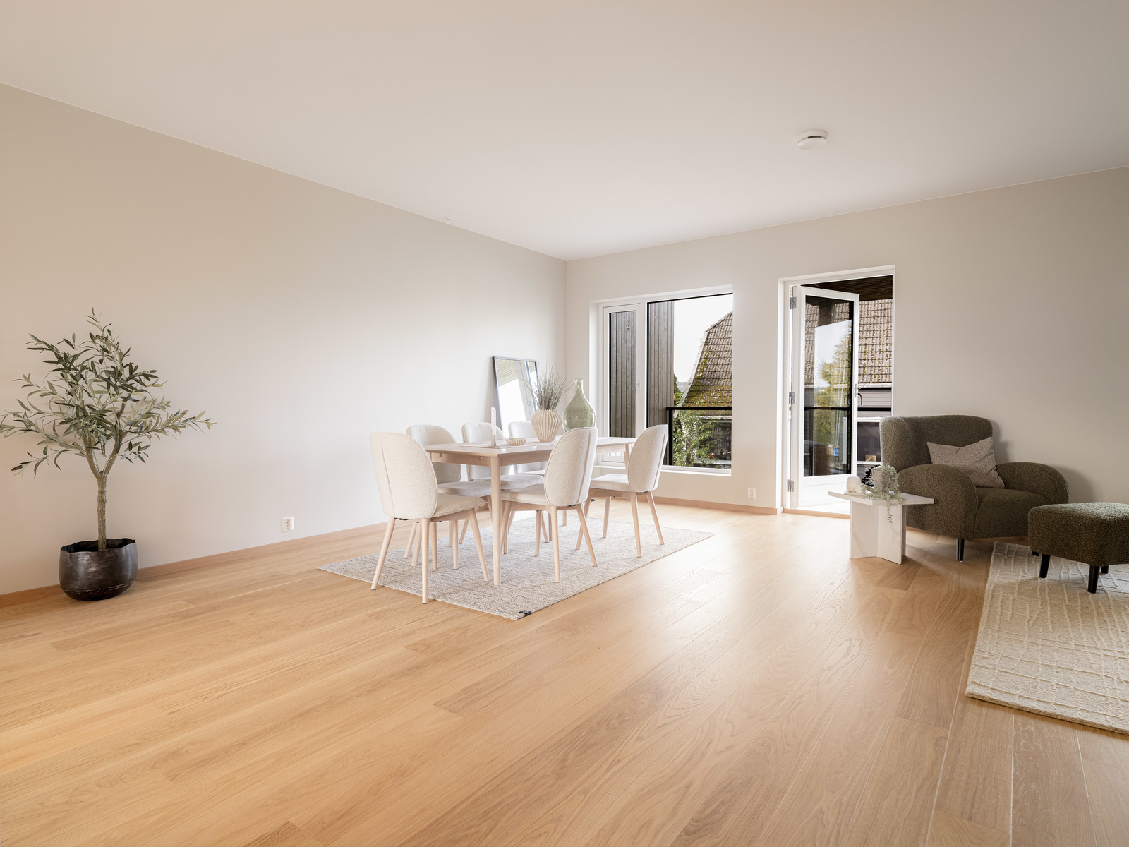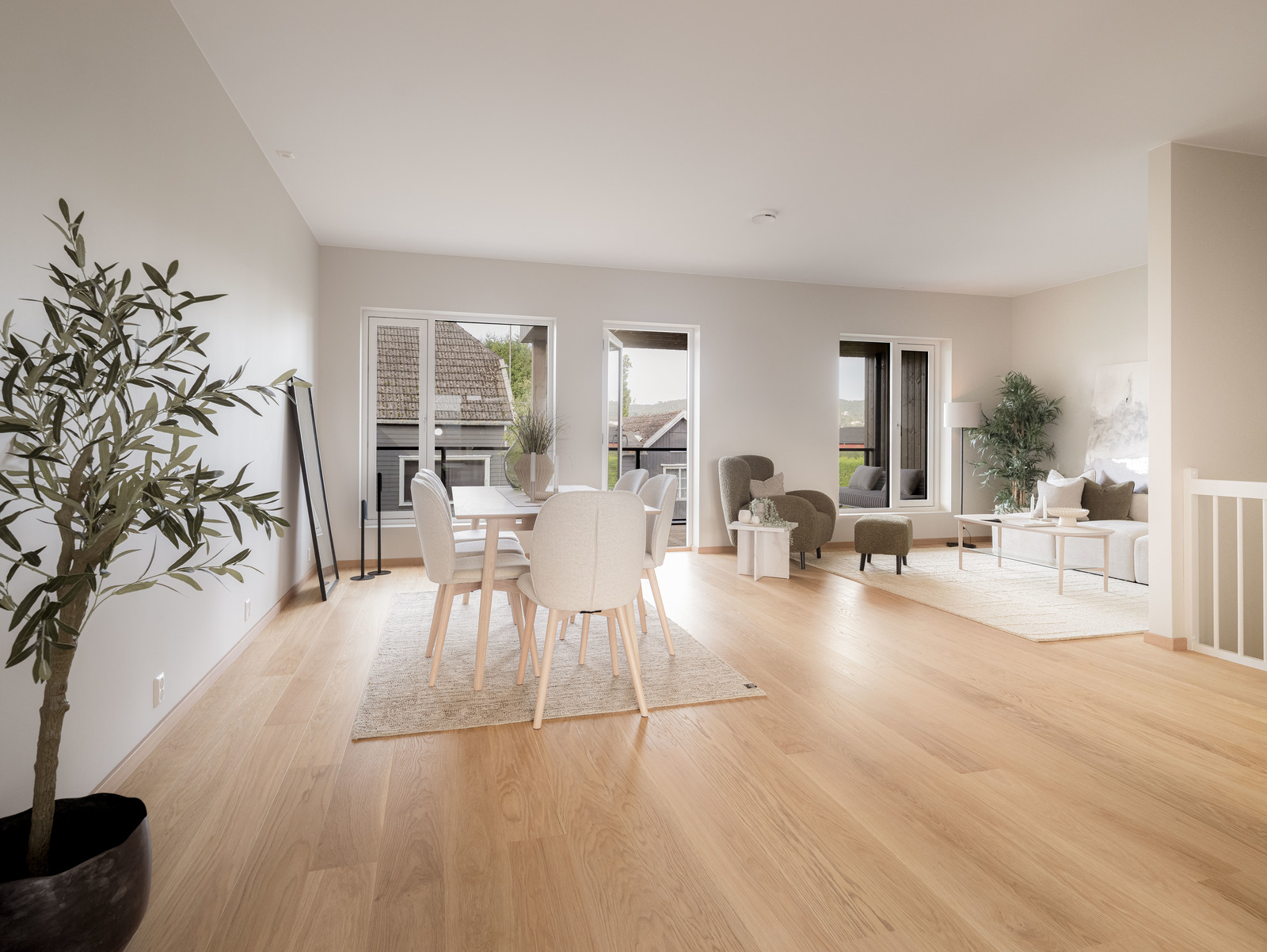 Vannbåren varme under lys 1-stavs eikeparkett i alle oppholdsrom gir økt komfort. Ekstra takhøyde gir ekstra god romfølelse.
