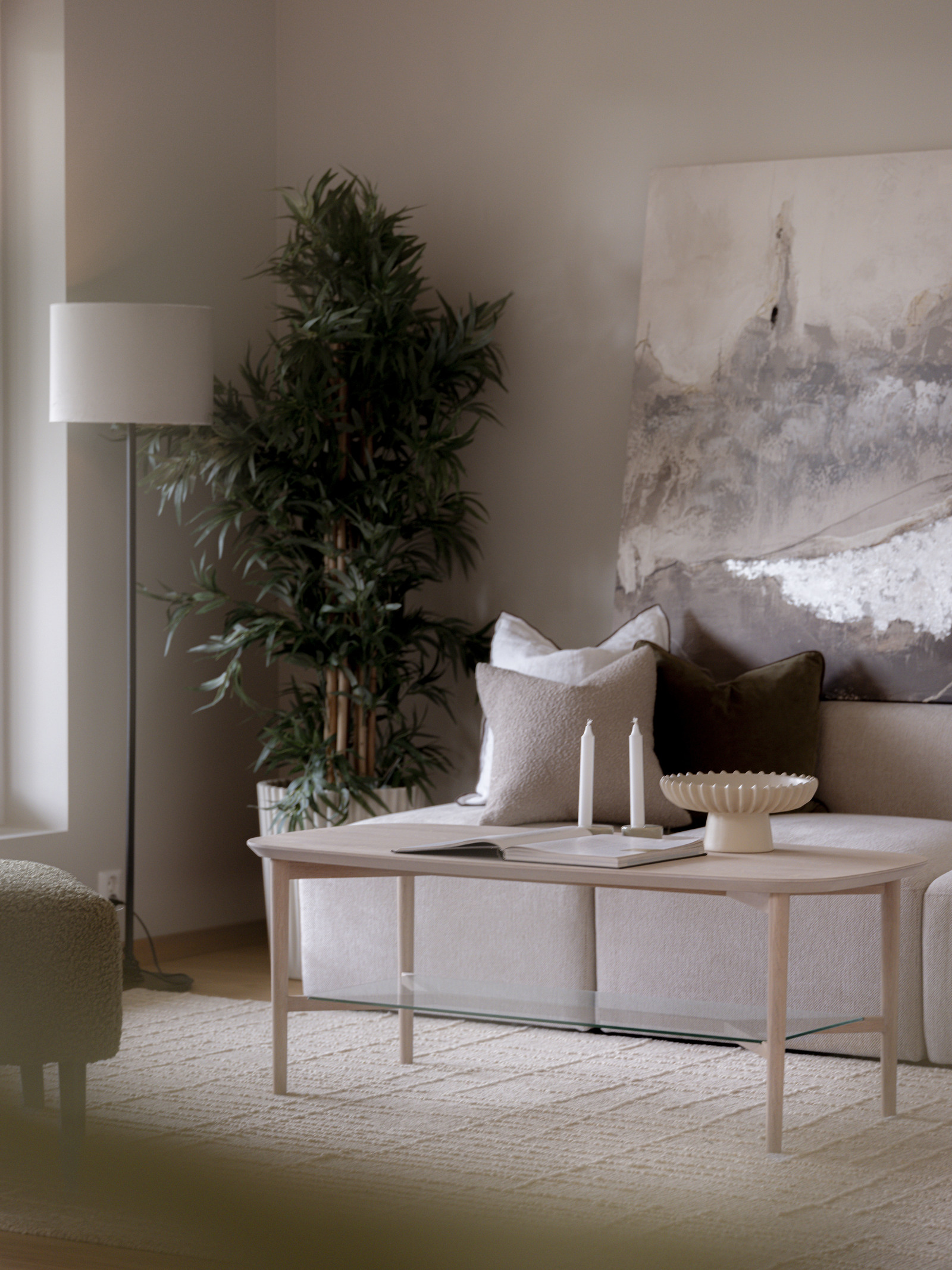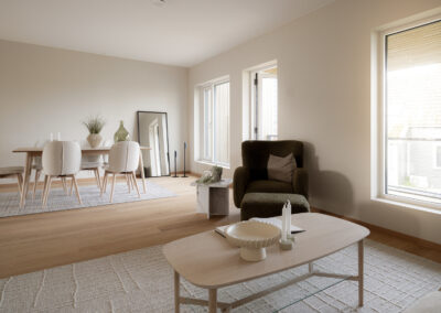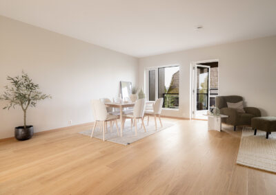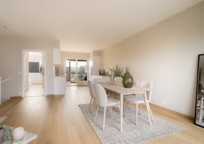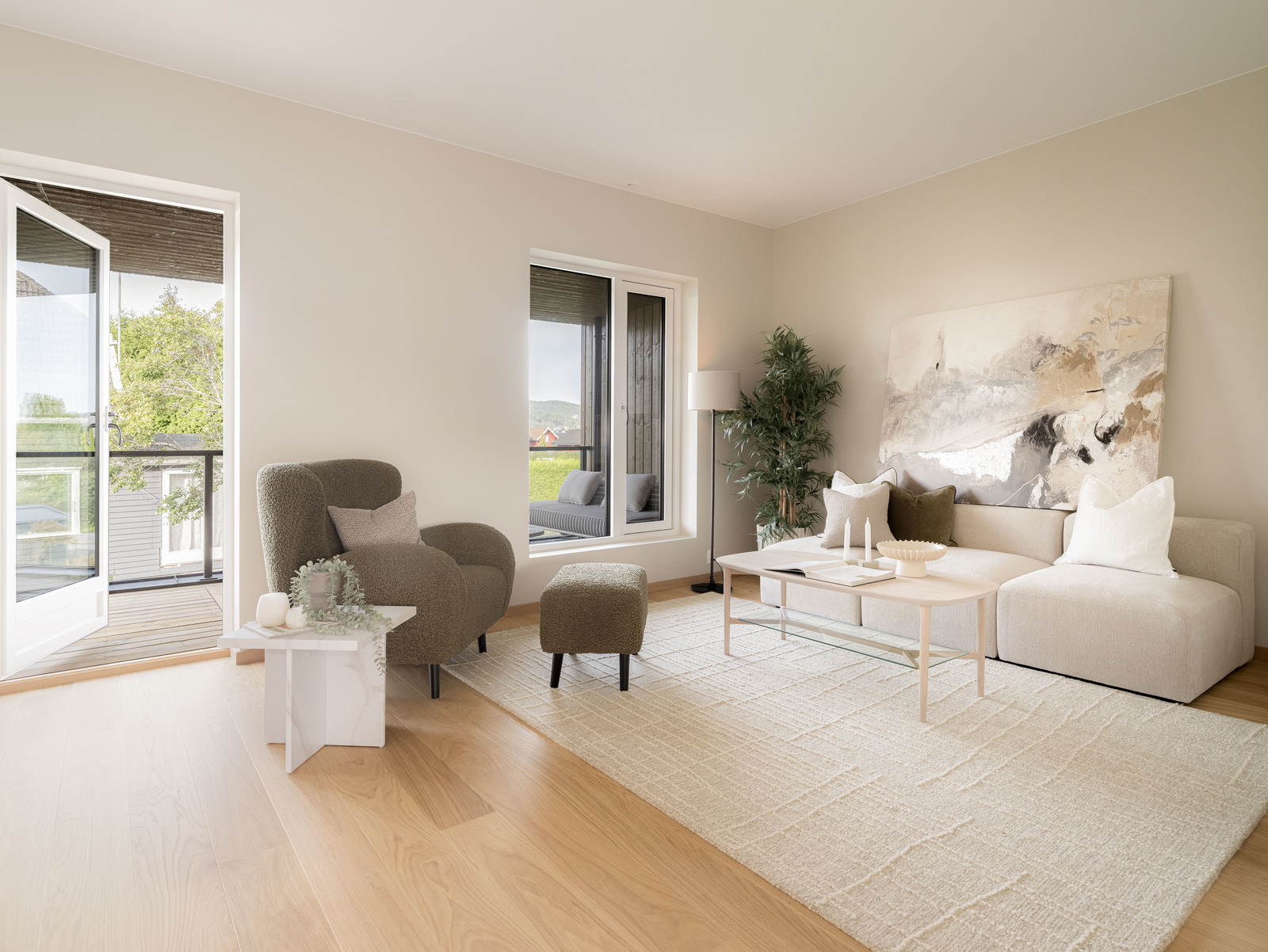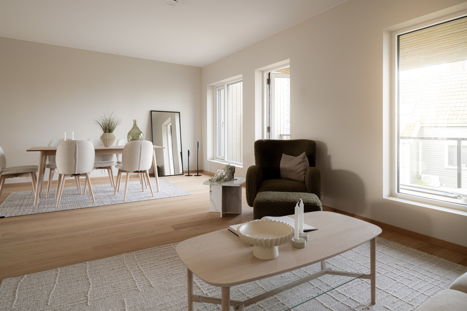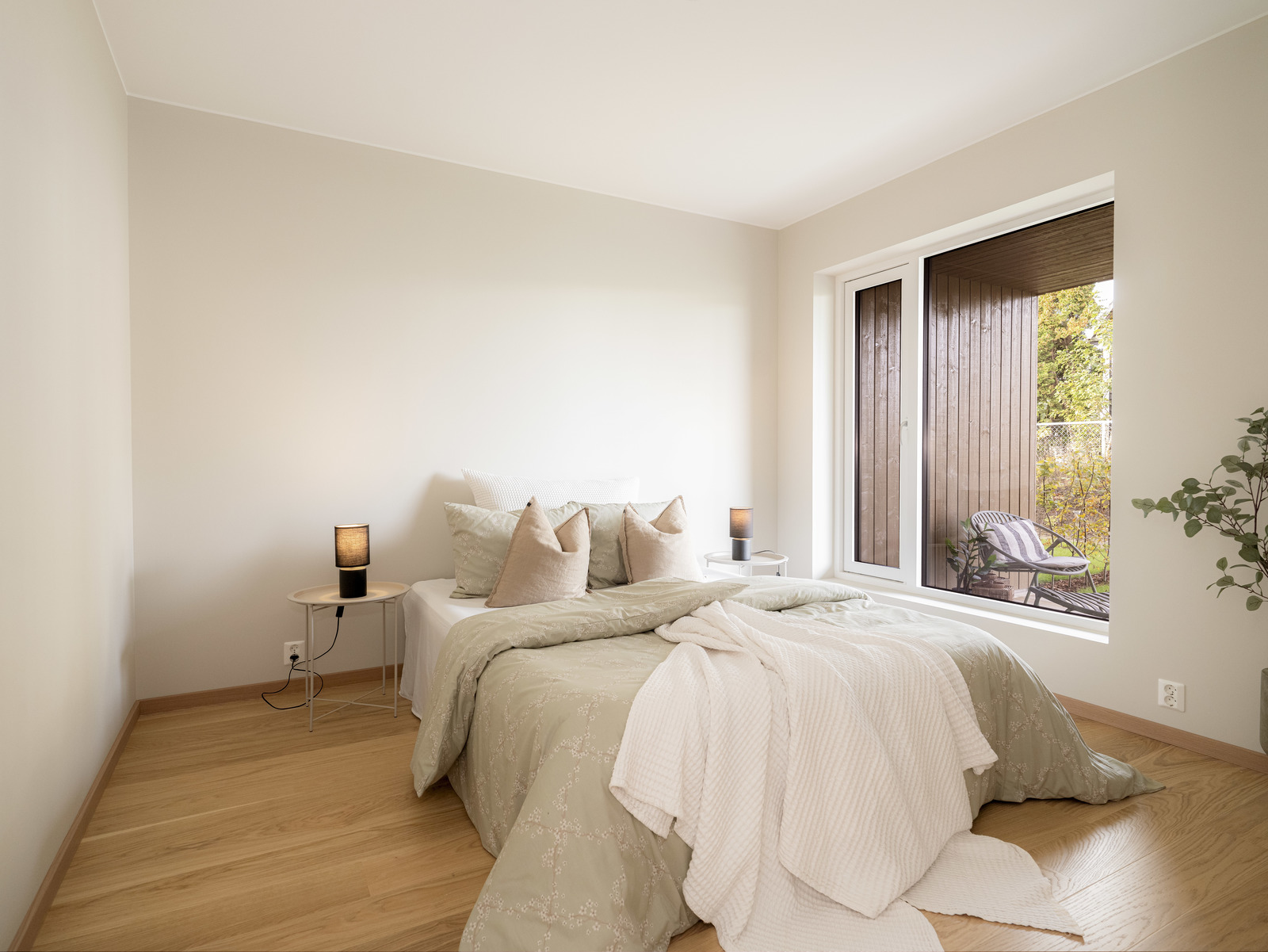 Vannbåren varme under lys 1-stavs eikeparkett i alle oppholdsrom gir økt komfort. Ekstra takhøyde gir ekstra god romfølelse.