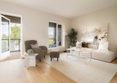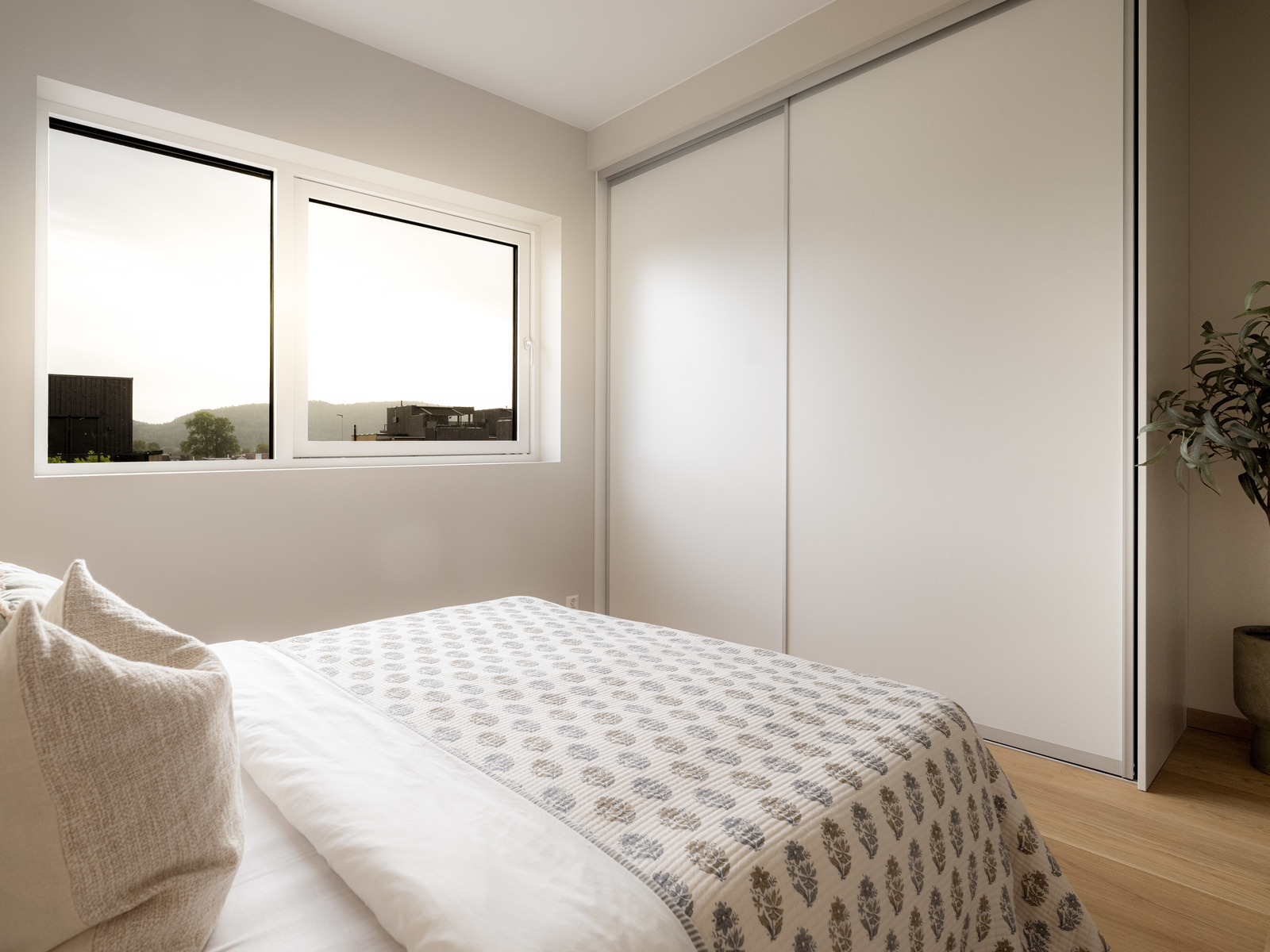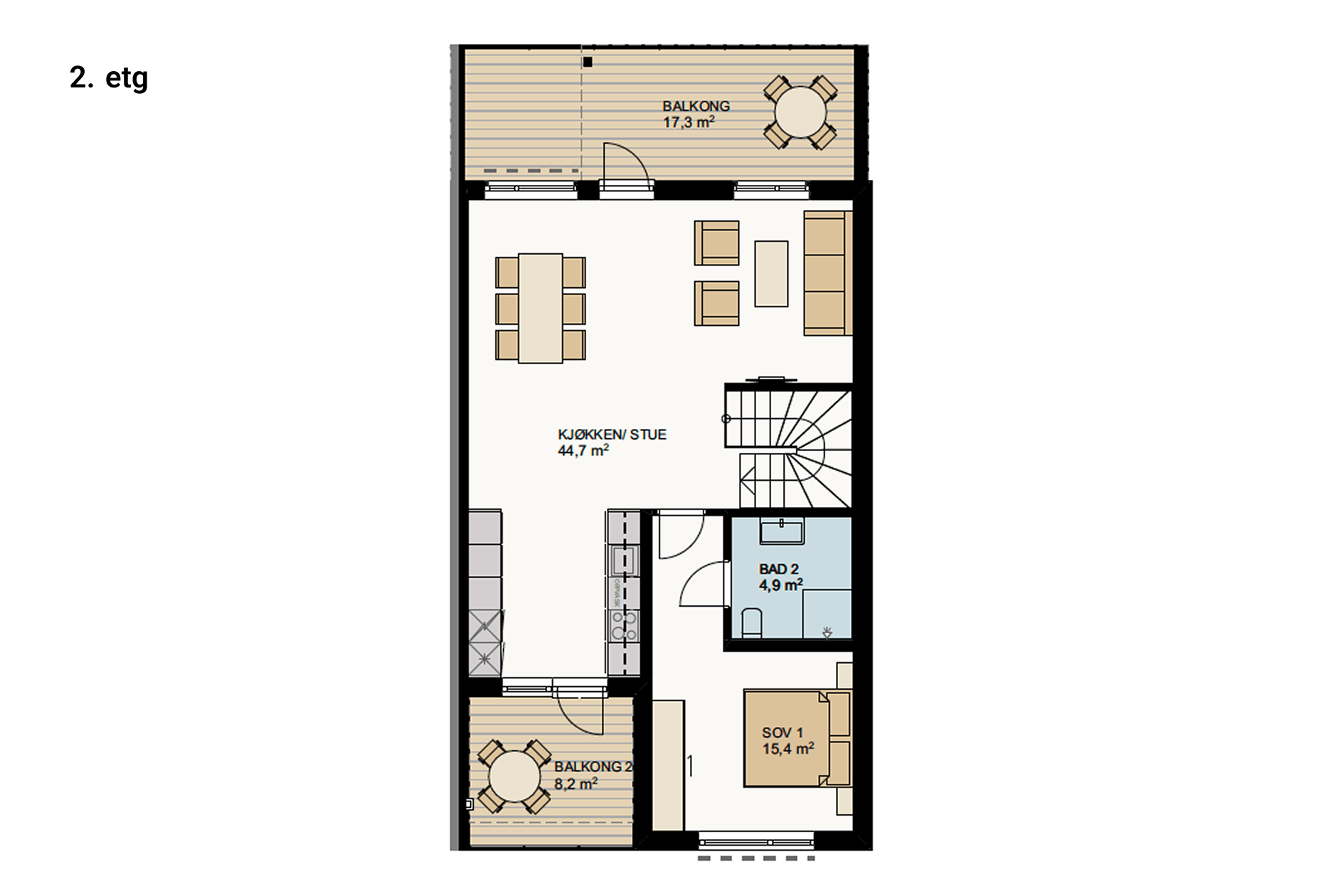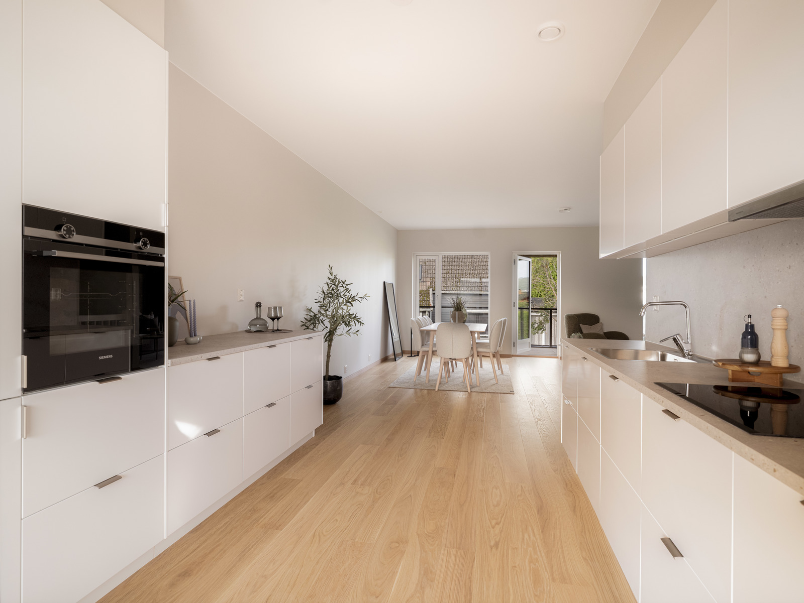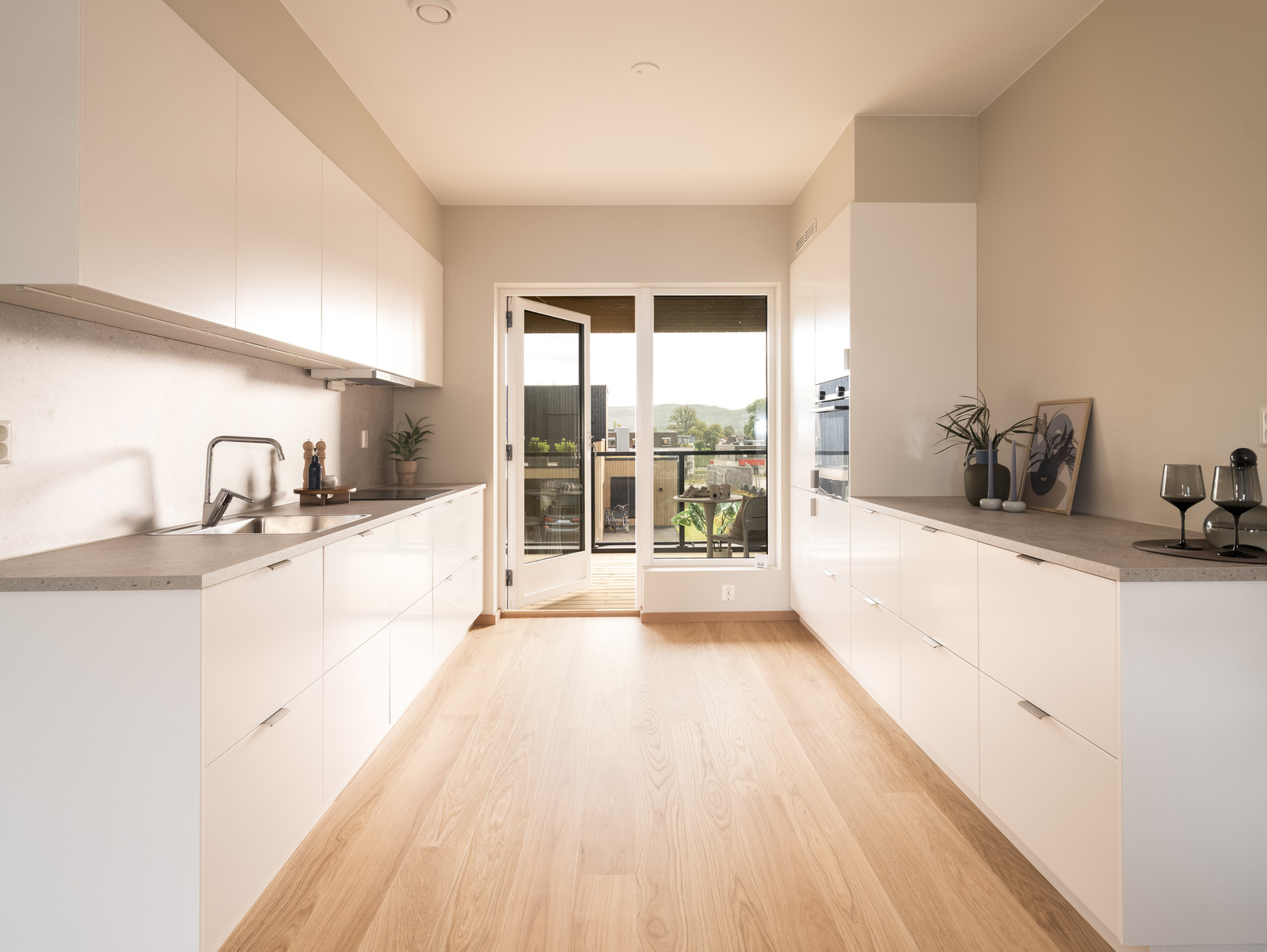 Andre etasje åpner seg opp i en lys og romslig stue- og kjøkkenløsning. Det lekre kjøkkenet fra Drømmekjøkken er svært innholdsrikt, har godt med skapplass og kommer komplett med hvitevarer fra Siemens. Balkong mot både øst og vest sørger for gode solforhold. I denne etasjen finner du også hovedsoverommet med garderobeskap og eget bad.